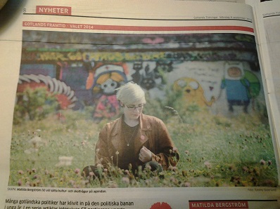 2014-09-16: Matilda Bergström (V) vid graffitiväggen i politiskt porträtt i GT (Gotlands Tidningar). Säga vad man vill om politiker men den här tösen har i alla fall den goda smaken att välja en fin bakgrund. Vi får se om våra politiker i Region Gotland ser till att väggen står kvar eller att en ny vägg ställs i ordning så att alla graffare kan få fortsätta måla lagligt. 2014-08-31: I eftermiddag spelades en episod in vid väggen för en fejkad webdokumentär. Filmen handlar om två rappare och deras försök att slå igenom i musikbranschen. Förhoppningsvis kommer länk senare.